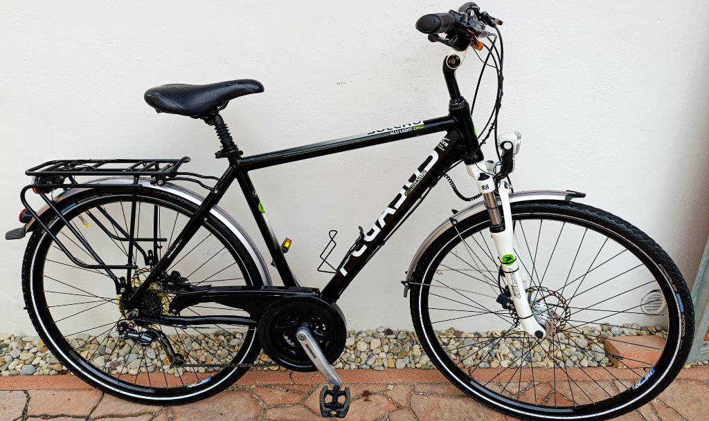 Velmi pěkné kolo , velikost ALU rámu 53 cm - 21", přední odpružená vidlice, Převody Schi,ano DEORE 3x8, hydraulické kotoučové brzdy, pláště 28", osvětlené v náboji předního kola, stojan, kryt řetězu, blatníky, nosič. Doprava 340,-